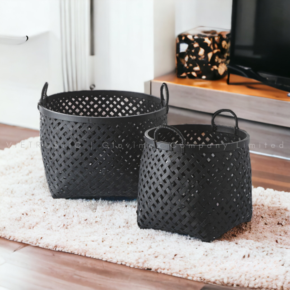 Check out our round bamboo basket set of 2, which come with easy-to-use handles. They are available in bulk, with different color options such as white, grey, black, and more. Specific sizes or colors are welcomed. These baskets are great for storing things like toys, decorations, and essentials, combining practicality with style for your home organization.