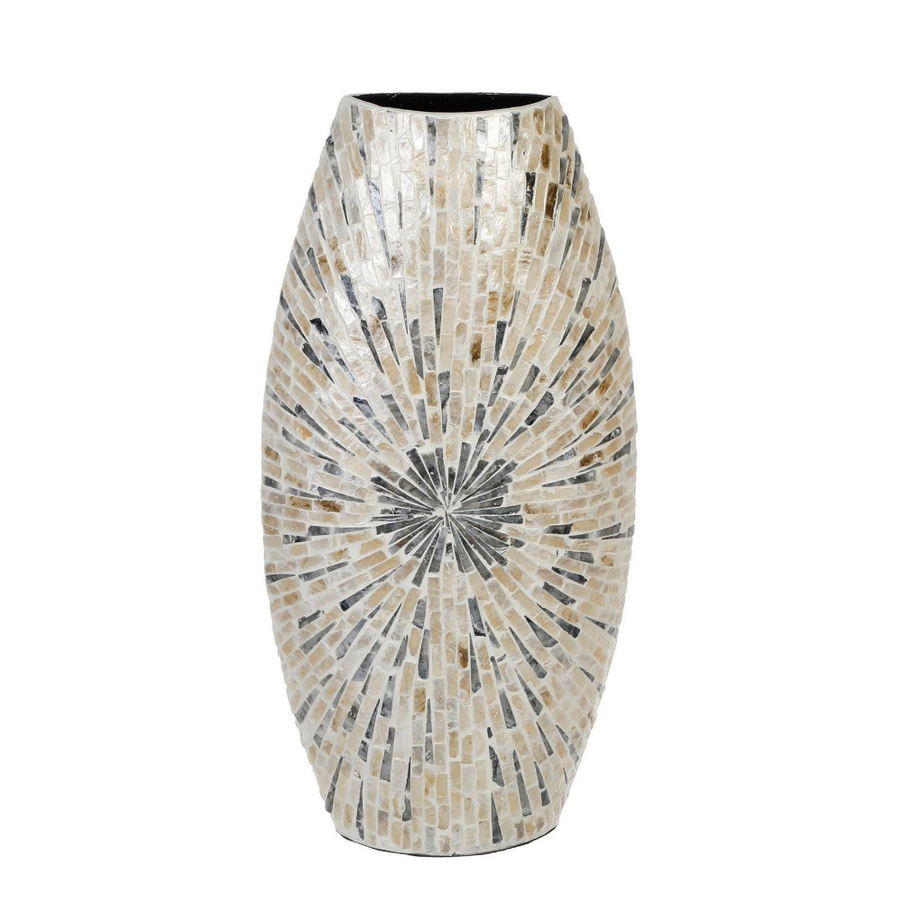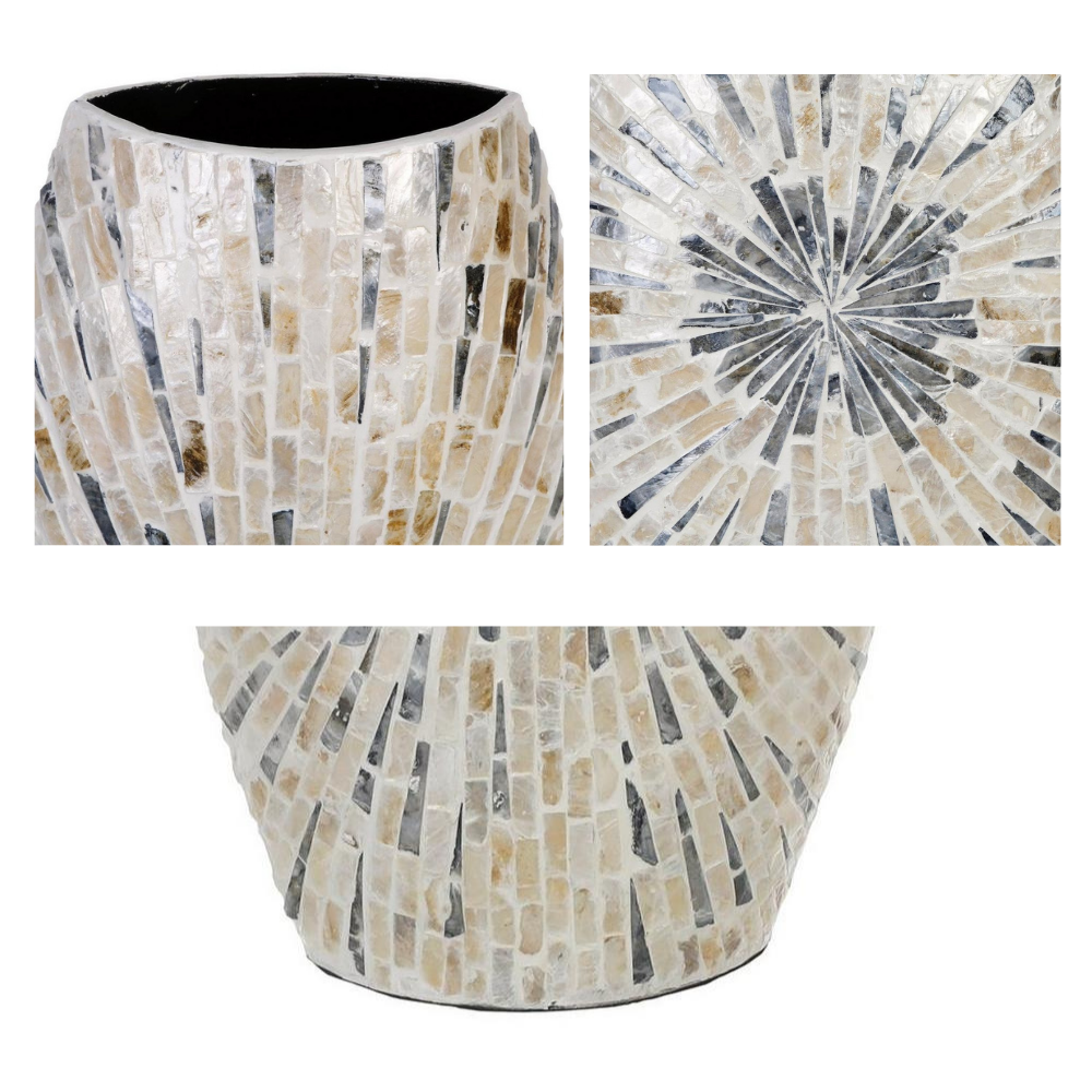 This vase is a stunning piece of modern decor. Made from natural mother of pearl, it shines with an iridescent quality that catches the eye and adds a touch of elegance to any room. The pearlescent finish of the vase is a unique touch that sets it apart from other decorative pieces. It is perfect for displaying a bouquet of flowers, or as a statement piece on its own.